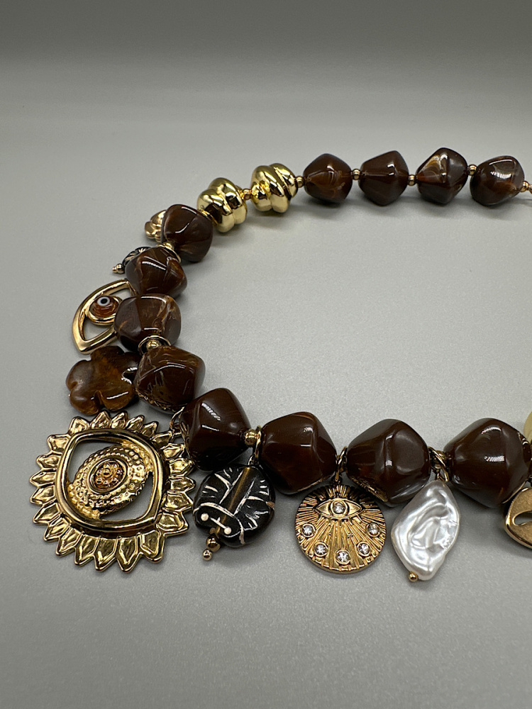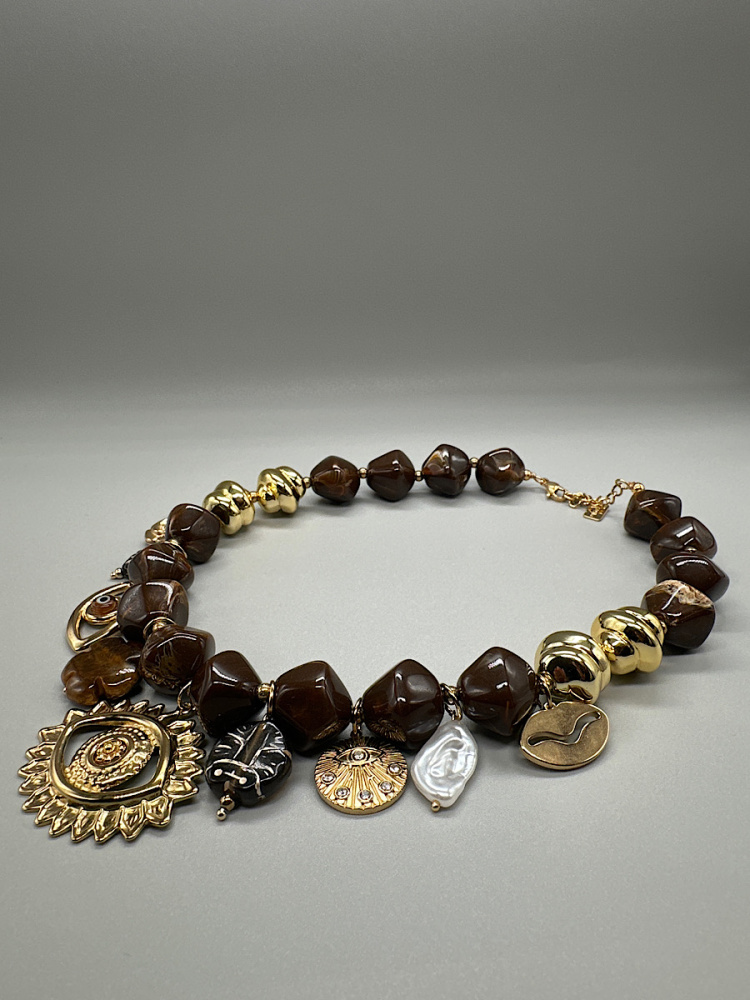 - Détails : Collier de perles ovales marron avec breloques dorées